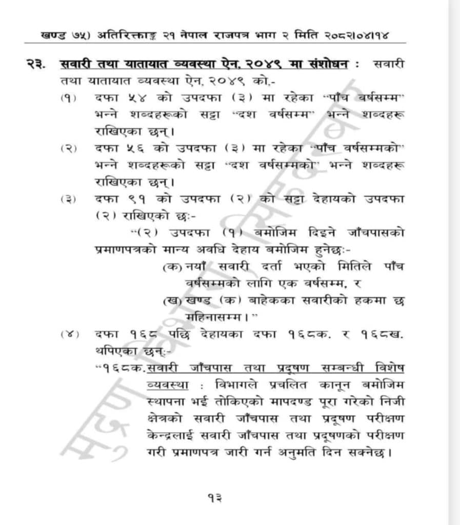 काठमाडौं, साउन १८ । सवारी चालक अनुमतिपत्र (लाइसेन्स) को अवधि १० वर्ष कायम भएसंगै यातायात व्यवसायी हर्षित बनेका छन् । सरकारले ‘केही नेपाल ऐन संशोधन गर्न बनेको विधेयक’ राजपत्रमा प्रकाशित गरेसँगै सवारी तथा यातायात व्यवस्था ऐन, २०४९ मा रहेको ५ वर्षे अवधिलाई बढाएर १० वर्ष पुर्याइएको हो। नेपाल सरकारले सवारी तथा यातायात व्यवस्था ऐन २०४९ को दफा ५४ र ५६ को उपदफा ३ संशोधन गर्दै २०८२ साउन १४ गतेदेखि लागू हुने गरी यो नयाँ व्यवस्था ल्याएको हो।