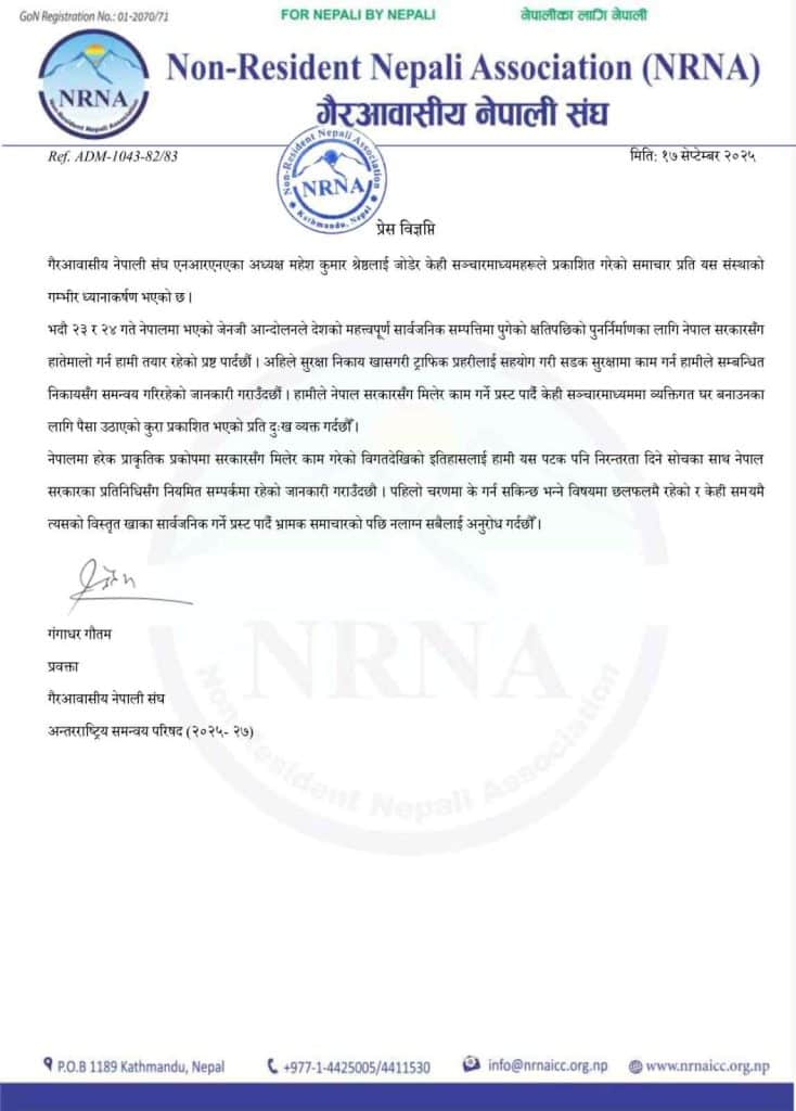 काठमाडौं – गैर आवासीय नेपाली संघ (एनआरएनए) ले संघका अध्यक्ष महेश कुमार श्रेष्ठलाई जोडेर केही सञ्चारमाध्यमहरूले प्रकाशित गरेको समाचारप्रति गम्भीर ध्यानाकर्षण भएको जनाएको छ। संघले सार्वजनिक सम्पत्तिमा क्षति पुगेको पछिल्लो ‘जेनजी आन्दोलन’पछि पुनर्निर्माणमा नेपाल सरकारलाई सहयोग गर्न तयार रहेको स्पष्ट पारेको छ।